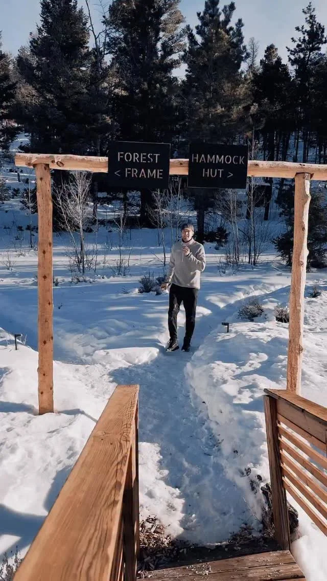 A small glamping option with full size “A” window designed with an oversized deck and hanging bed nestled in the trees designed to promote spending time outside without sacrificing privacy.