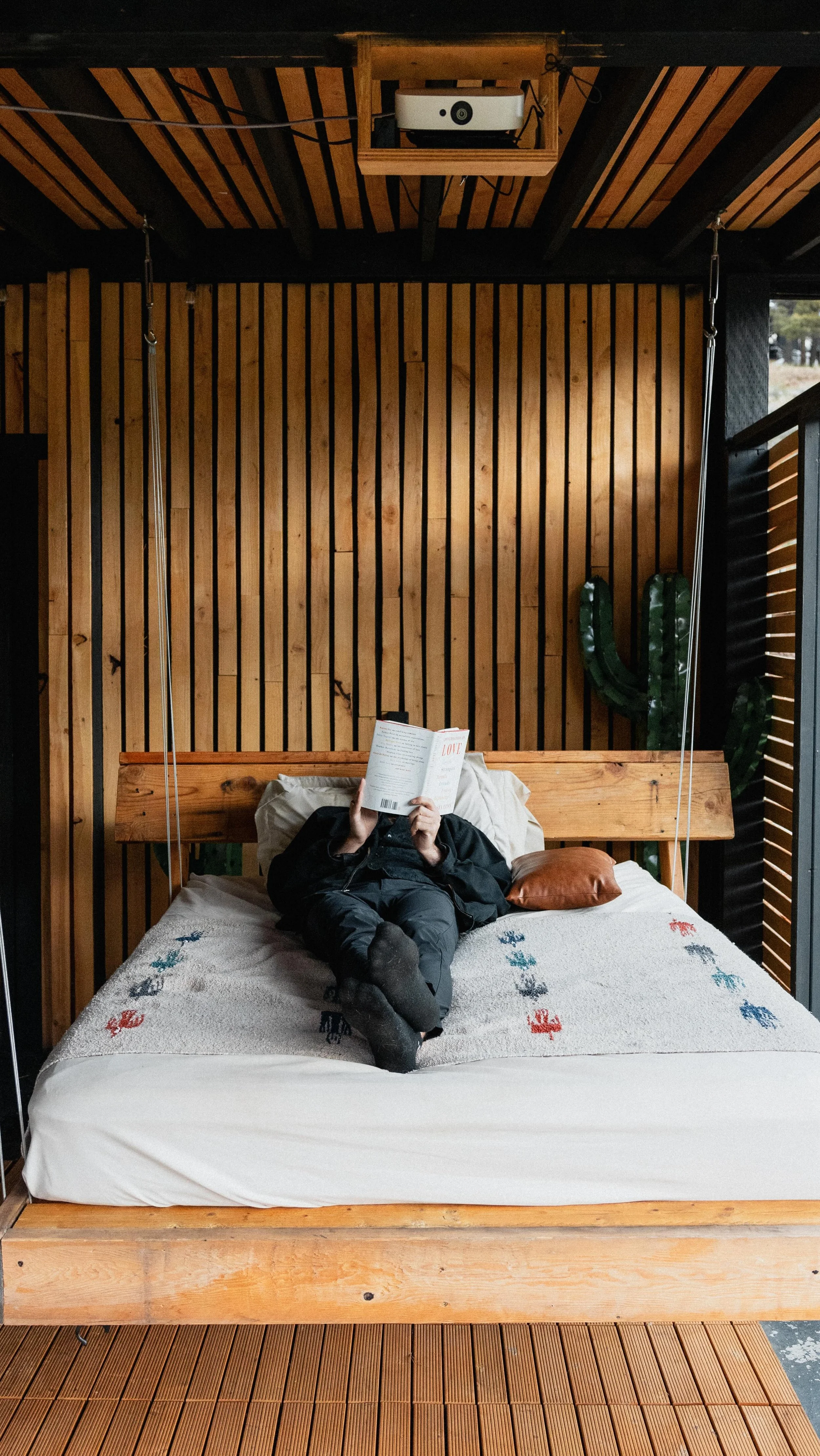 One of our newest cabins, complete with massive outdoor spaces including an outdoor hammock, outdoor bed, and projector,