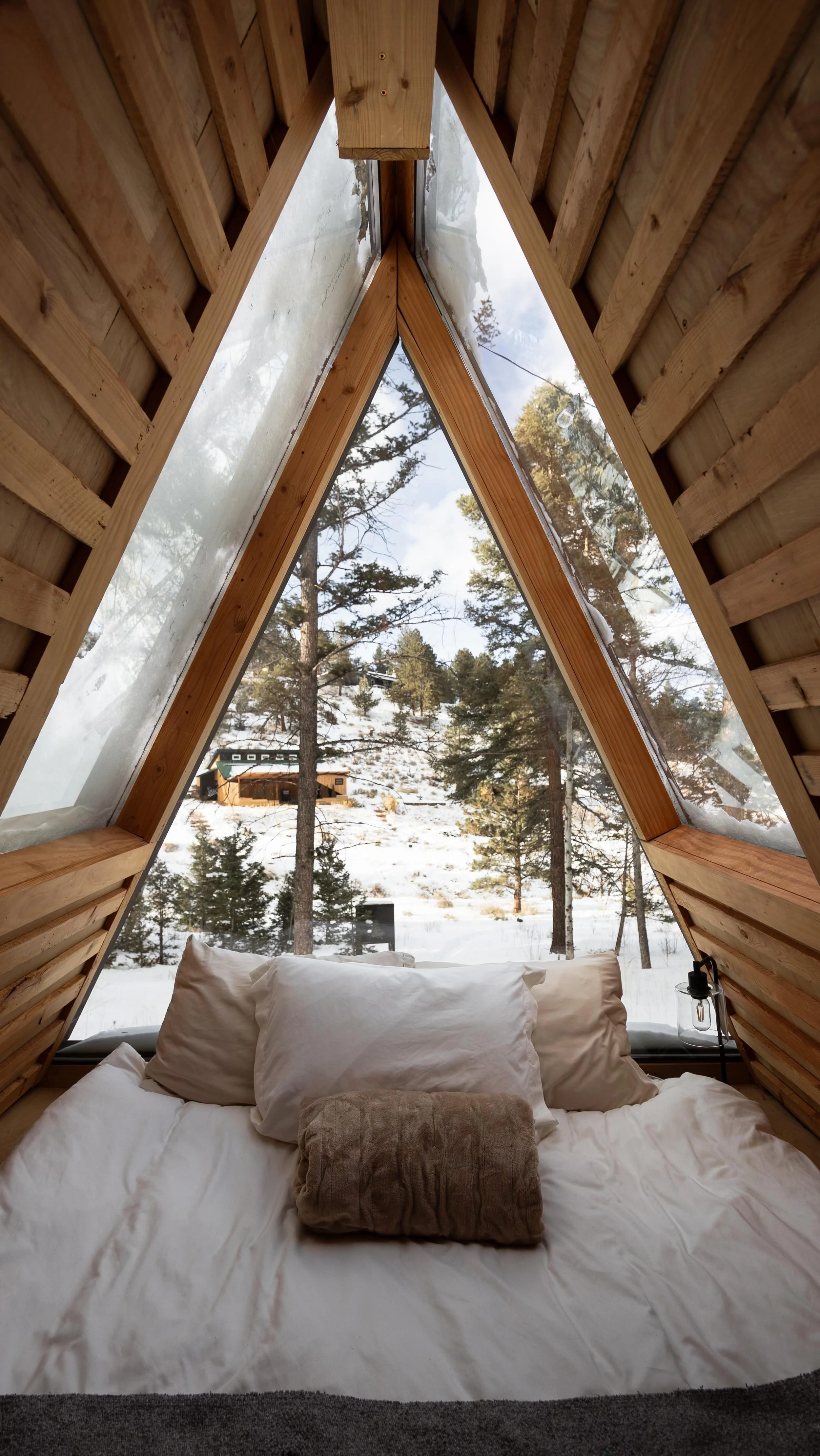 A unique, private, and striking space, the Glass Greenhouse is built into the mountain behind it with nearly all glass on the back side and privacy at the front. There’s a full bed outside in the slatted and covered deck space and barn doors that open up to it for an indoor outdoor vibe.