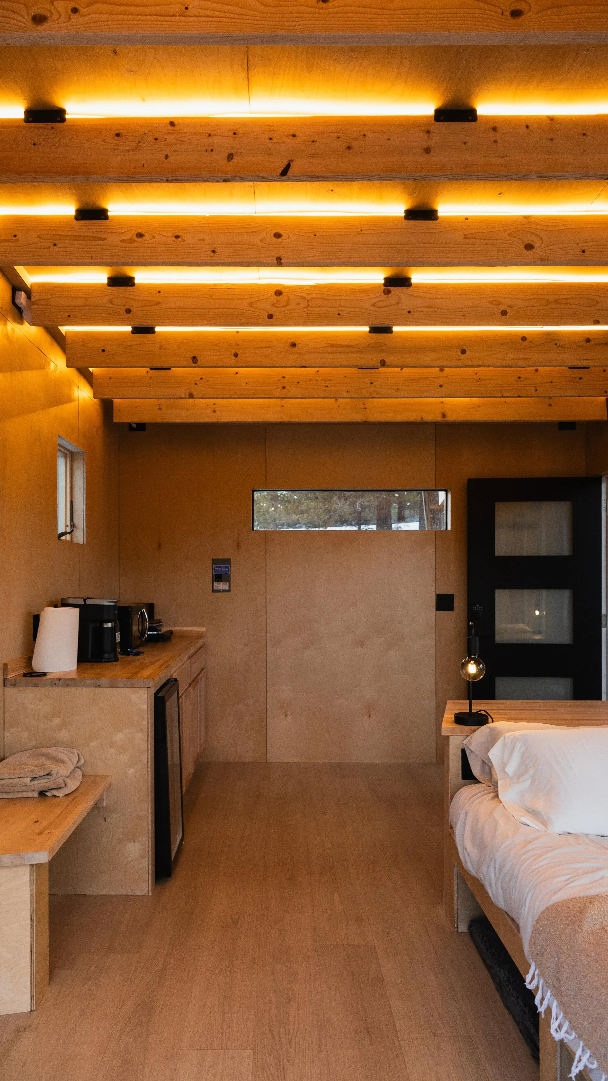 The largest cabin on the Salida Site, complete with a toilet, two sinks, an indoor loft, 3 queen indoor beds, indoor and outdoor projector screens, and a massive 500 square foot private outdoor patio area. An all wood interior is complimented by two six foot windows on the sides allowing plenty of natural light in during the day.
